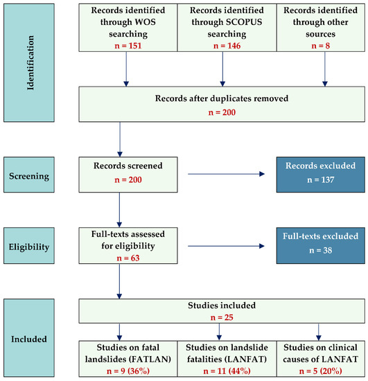 The selection of relevant papers was performed using the hierarchical approach proposed by Moher et al. [11], which allowed the identification of 151 papers in WOS and 146 papers in SCOPUS (Figure 2). An additional 8 papers, identified using other sources, were also added, thus reaching a total of 305 records. The elimination of duplicate records allowed the identification of 200 papers to be screened (Figure 1). Then, article screening allowed us to eliminate 137 papers that did not analyze landslide mortality, even if their titles included the search terms (i.e., [12,13,14]).