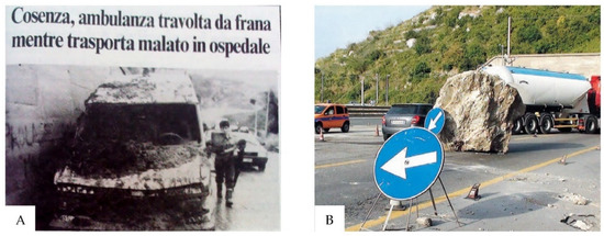 (A) 15 May 1993, Cosenza (Italy), an “ambulance hit by a landslide while carrying a sick person to the hospital” (from the newspaper “La Gazzetta del Sud”). (B) 12 May 2010, a block of rock on the Calabrian highway (Italy), from [41].