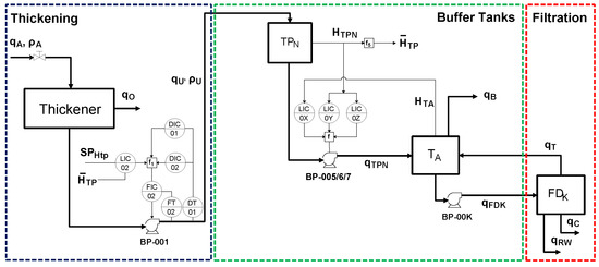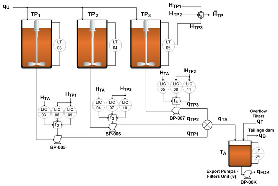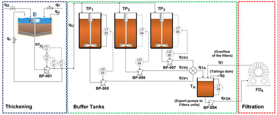 As described in Section 2, the dewatering plant is composed of subprocesses. The first subprocess consists of pulp thickening. Then, the pulp is transported and stored in tanks, which have volumes capable of absorbing variations in the process flow. These tanks feed the filtration stage, which removes residual water, delivering ore with low moisture content.