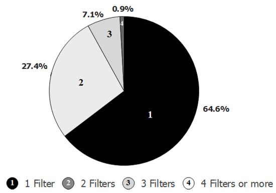 The main problem in the dewatering process under study is the frequent failure of the disc filters. To illustrate this problem, consider data from 2520 h of operation of the filter units. During this period, for a total of 1498 h, i.e., of the time, at least one filter was out of service due to a failure condition. For this period under failure, Figure 3 shows the percentage of the number of filters that had problems. Note that of the time, failure occurred in only one disc filter; of the time, the failure occurred in two filters simultaneously. The high frequency of failure has a direct impact on the productivity of the dewatering plant. In this way, the implementation of a control strategy capable of maintaining the operation of the process even in the event of disc filter failure becomes essential.