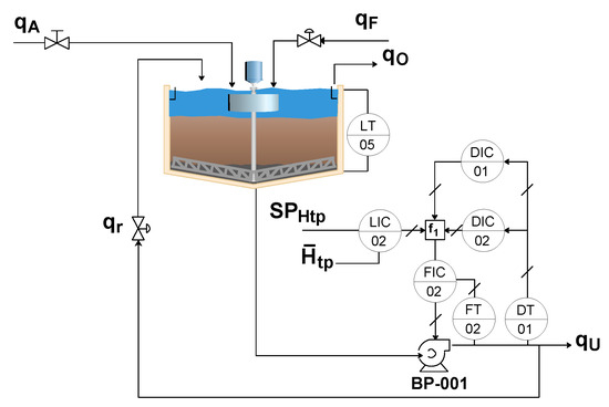 Note that the control structure described provides selectivity to the system since only the pumps connected to buffer tanks operating under normal conditions control the storage tank level. Note also that the level control of the buffer tanks is carried out using pumps BP-005, BP-006 and BP-007. These controllers are activated only when the operational limits of the buffer tanks are reached. In this way, under normal operating conditions, the proposed control strategy uses the flow rate of the underflow of the thickener as the MV to control the buffer tank levels. This strategy is illustrated in Figure 6, where LIC02 controls the average level of the buffer tanks, . In addition, loops DIC01 and DIC02 are related to the minimum and maximum density restriction controllers, respectively.