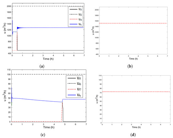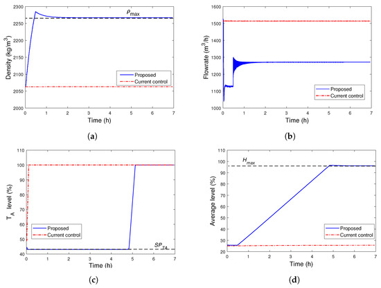 At time h, the stopping of two filters of the dewatering process is simulated. The aim is to analyze how long the plant could operate without a complete shutdown due to the overflow of the storage tank (). Figure 8 shows the main process variables of the proposed and current control strategies. The MVs are illustrated in Figure 9. Because the outputs of the controllers are subject to selector override control, the variable is used to highlight the signal actually selected and applied to the actuators. For the sake of simplicity, the loops for tanks () and () are omitted in all cases since they present similar characteristics to the loop of tank .
