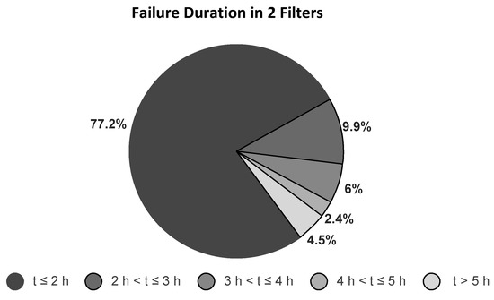 For the period of operation analyzed, Figure 10 shows a duration of filter failure corresponding to of the time under the failure of up to two filters. Note that when two filters fail simultaneously, of the stoppages last less than three hours and of the failures last less than 5 h. Thus, the proposed control strategy is able to guarantee the continuity of operation in the majority of failure cases.