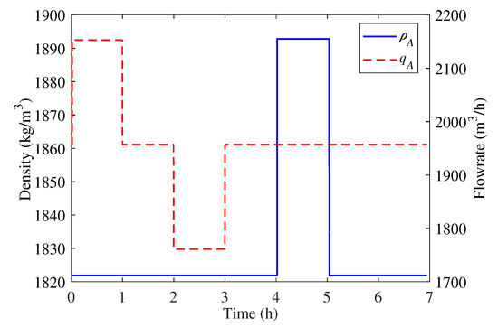 The proposed control strategy is now evaluated under process disturbances. Disturbances in the flow rate and density of the fed material are illustrated in Figure 11. At time h, an increase of in the thickener feed rate () is introduced into the system. At h, the feed flow returns to the initial value, and a decrease occurs at time h. At h, the feed flow returns to the initial value and remains there until the end of the simulation. At h, the feed density () increases by before returning to the initial value at h.