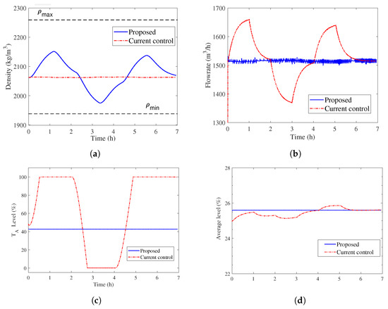 The underflow density presents an oscillatory characteristic due to the integrated control strategy. Even so, according to Figure 12c, storage tank does not overflow due to the disturbance. However, for the current and nonintegrated control, the storage tank level overflows according to the variation in the feed flow rate. According to Figure 12b, the underflow flow rate does not change under the proposed control strategy for any disturbances. For the current and nonintegrated control, it is observed that the flow rate varies by approximately 150 m/h, which causes variations in the average level of the buffer tanks, as shown in Figure 12d.