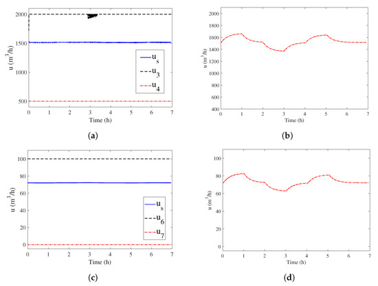Figure 12 shows the main process variables under the proposed control strategy and current control. The MVs are illustrated in Figure 13. The variable is used to highlight the signal actually selected and applied to the actuators. Again, for the sake of simplicity, the signals of the loops for tanks () and () are omitted for the same reasons already discussed.