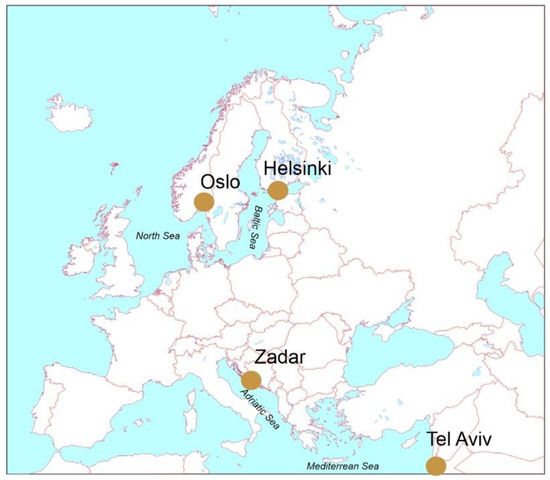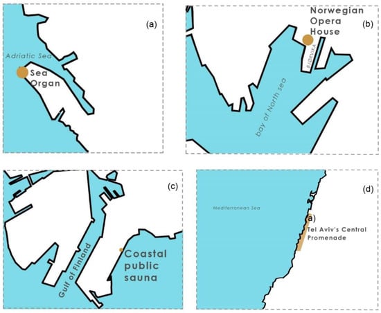 The four chosen study cases (Sea Organs in Zadar, Norwegian National Opera and Ballet in Oslo, coastal public sauna in Helsinki, and Tel Aviv’s Central Promenade) are located in Europe and Israel (Figure 1). Two of them, located in the north, experience a temperate climate, and the other two are situated on the Mediterranean sea, having a subtropical climate.
