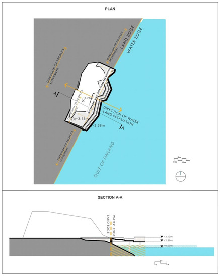 The Coastal public sauna is located less than two kilometres away from the Helsinki city center, on the Hernesaari peninsula built up on top of land reclaimed from the sea. Hernesaari area has been a hub for the port activities and at the same time functioning as the breakwater protecting the West Harbour. Currently the plot is being redeveloped into a vibrant residential area with a large beach park. The project is an initiative of Helsinki city. A costal public sauna is located in site of Beach Park. The park will be a part of a broader “Helsinki park” connecting the area along the shoreline to the city centre. The building and surroundings of the public sauna in Helsinki are designed to use the entire network of visual connections to the water. The square by the waterside in front of the sauna is equipped with stairs and ladders, with the help of which users can enter the water and take a bath in the sea after using the sauna (Figure 5). So, although there is a possibility of direct contact with the water at this point, the users of the main part of the square are not able to physically touch the water. The large part of the square is situated above the water’s surface, so, the line of the quay’s crown, on which the main pedestrian path is located, is shifted back towards the land in relation to the shoreline. Such a solution is dictated, among other things, by the specific climatic conditions of the Bothnian Bay, including, in particular, the icing of the basin in Winter and the impact of ice on the structure of the facility’s foundations.