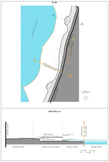 The previously existing type of land–water edge of the Tel Aviv waterfront was of a “flexible sloping” type, but from the place where the construction of a retaining wall supporting the road infrastructure was being located, this changed its character into a “fixed vertical”. The new water–land edge is also determined by the shoreline, so its position varies according to the current sea level. It can therefore be classified as a “flexible sloping” edge, as it was before redesigning the waterfront. The “fixed vertical” (strong) edge is still present in this solution, however it was moved from the previous location (a retaining wall) towards the water, where it was hidden in the construction of the view points and coffeehouse, taking a shape of a dune.