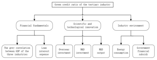 Based on relevant information [6], Zhang Yunhui and Zhao Jiahui found that there is a non-linear relationship among green credit, technological progress and industrial structure optimization [9]. Long Yunan and Chen Guoqing analyzed the current situation of China’s green finance development and the mechanism and system construction of China’s industrial-structure adjustment promoted by green finance, and established a grey correlation model to perform an empirical analysis of the correlation between green finance and industrial structure [10]. Yu Fei and Huang Ruiling explored the mechanism of the influence of bank credit on the optimization and upgrading of the industrial structure [11]. The green credit ratio of the three industries is mainly affected by the three major system factors of industrial finance fundamentals, scientific and technological innovation and industry environment. The specific influencing factors are presented in Table 4 below: