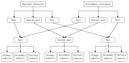 Taking into account the regional differences between the eastern, central and western regions, the regional characteristics of the three regions are taken into consideration. This paper selects the regional characteristics of three major regions (annual GDP of each region) and local government’s expenditure on energy conservation and environmental protection as the first-level influencing factors to determine the three major regions, and then based on the results of the new model in “Figure 1: Analysis on the influencing mechanism of green credit ratio on industrial structure optimization rate”, the green credit ratio of three major industries is used as the second-level influencing factor to determine the three major regions. As shown in Figure 2: