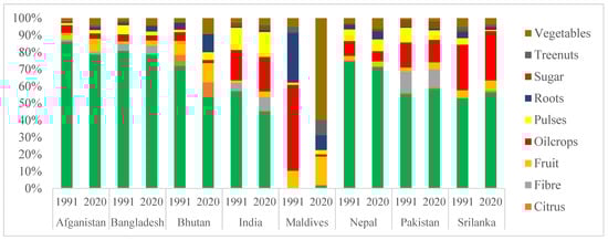 Figure 1 depicts the share of cereals, citrus, fiber crops, fruit crops, oilseeds, pulses, root crops, sugar crops, tree nuts, and vegetables produced in Bangladesh, Bhutan, India, Pakistan, Nepal, Sri Lanka, Maldives, and Afghanistan from 1991 to 2020. Even though the share of cereals has decreased in most countries, cereals will continue to dominate South Asian agriculture in 2020. The area share under cereals ranges from 78 percent (Bangladesh) to 1.80 percent (Maldives). In India, the area under cereals decreased from 57.08 percent in 1991 to 45.13 percent in 2020, which was primarily replaced by fiber crops, fruits, oilseeds, pulses, and sugar crops, the share of these crops increased by 3.20, 1.92, 2.38, 1.57, and 0.48 percent, respectively, in 2020. Over the last three decades, there have been significant changes in the country’s oilseeds scenario, which is reflected in Figure 1 [20]. In 1991, oilseeds covered more than half of the agricultural land in the Maldives, but by 2020, the area under oilseeds was replaced by vegetables.