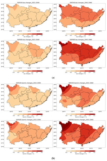 The CMIP6 multimodel ensemble data were used to predict the future changes in four key climate factors affecting citrus yield under different scenarios and different periods in the future as shown in Figure 6 (Figure 6a–d). The mean temperature in October shows an overall increase, as shown in Figure 6a. There is little difference between the simulation results of the two different scenarios, and the mean temperature range is between 0.5 °C and 1.5 °C in 2021–2040. Undoubtedly, the mean temperature range of the SSP5-8.5 scenario is significantly higher than that of SSP2-4.5 in 2041–2060. The range of mean temperature shows a phenomenon of increasing with latitude moving northwards in the citrus-growing areas. Figure 6b show that the mean minimum temperature in November presents signs of increasing in all regions, and the greatest warming trend is observed for northwestern Sichuan. In addition, the increasing range of most regions is approximately 0.5 °C higher under the SSP5-8.5 scenario than under the SSP2-4.5 scenario in 2021–2040, and the spatial distribution of the warming gradient is consistent with that in 2041–2060. In Figure 6c, the warming effect of the mean maximum temperature in September is approximately the same as that of the mean temperature in October in Figure 6a, except that the greatest warming effect shifts from the northwestern to the central and eastern parts of Sichuan. The mean relative humidity in October increases in the western region and decreases in the central and eastern regions, as shown in Figure 6d. The spatial pattern is approximately similar under the two scenarios during different future periods, while the decreasing trend is almost 0.5% higher in 2041–2060.