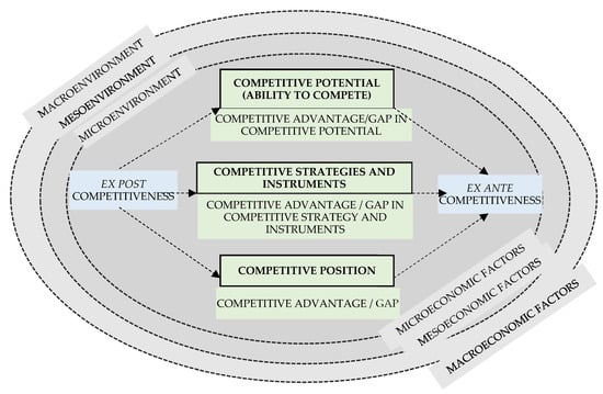 Competitiveness management is understood by the authors as having a continuous, intentional, well-thought-out, and well-planned impact on its particular subsystems, considering the existence of their mutual feedbacks []. It is a dynamic concept related to technical and organizational development [], in which an organization’s subsystems, considered from the perspective of its environment, include the following factors: