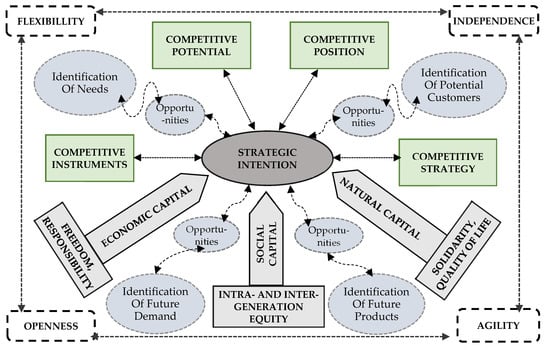 As part of the sustainable management of competitiveness, small business enterprises use the so-called classic components of the competitiveness of enterprises (their potential, competing strategies, and instruments for its implementation, as well as the obtained advantage, allowing a specific competitive position to be achieved). However, what distinguishes SB enterprises from large enterprises is the strategic intention revealed in the management process, instead of the classic strategy. Admittedly, in some of these enterprises, the strategic intention may turn into its competitive strategy (especially among the higher-sized classes of these entities). Nevertheless, in practice, a significant proportion of small business enterprises base their management solely on a strategic intention. Its foundation is capturing opportunities related to the identification of potential needs, future customers, future demand, or future products. When managing their competitiveness, SB enterprises exhibit qualitative features such as agility, openness, flexibility, and independence, which are a kind of activator for capturing market opportunities in terms of competitiveness.