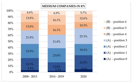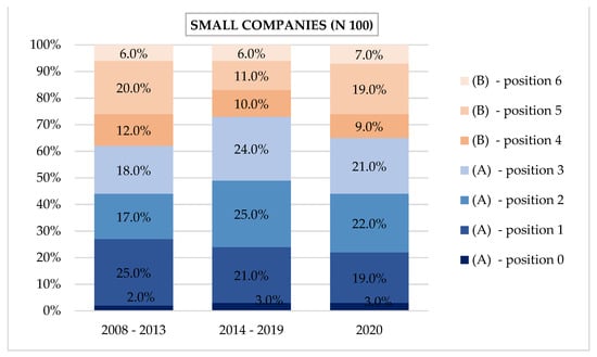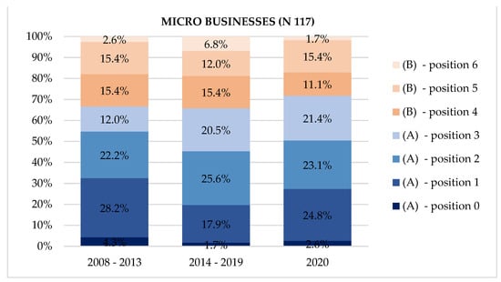 The obtained results of the survey of companies, related to the declared competitive position, are presented by company size (micro, small and medium) and the adopted research periods, i.e., 2008–2013, 2014–2019, and 2020. Additionally, the authors point to changes in the declared position, corresponding to the above groups.