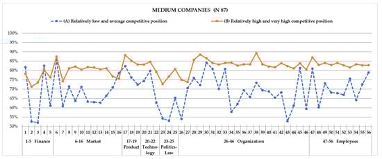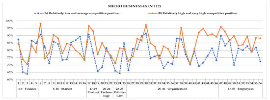 The results of the Kruskal–Wallis verification test show that in the group of companies declaring a low and average competitive position (A), micro, small, and medium companies record considerable differences only with regard to market- and product-related sources of competitive advantage. The analysis of entities with a high and very high competitive position (B)—apart from financial sources of competitive advantage—indicate that medium companies attribute greater importance to such factors as market, product, technology, politics and law, organization, and employees than micro businesses. The impact of effects is greater for entities declaring a high competitive position. Simultaneously, the Friedman variance analysis shows that micro, small, and medium companies with a high and very high competitive position (B) differ considerably in terms of the declared competitive position. The impact of effects is moderate, and only at the level of central tendency do small companies attribute greater importance to technological factors than financial ones as a source of competitive advantage. The remaining comparisons are insignificant. Micro and small companies declaring a relatively low and average competitive position (A) differ considerably in the main areas of comparison. In the case of medium entities, differences are insignificant. The post hoc analysis of micro businesses shows that products and technologies as the sources of competitive advantage are more significant than financial and political and legal factors. The impact of the effect for companies with a low competitive position is greater than for entities declaring a high position, but it remains moderate.