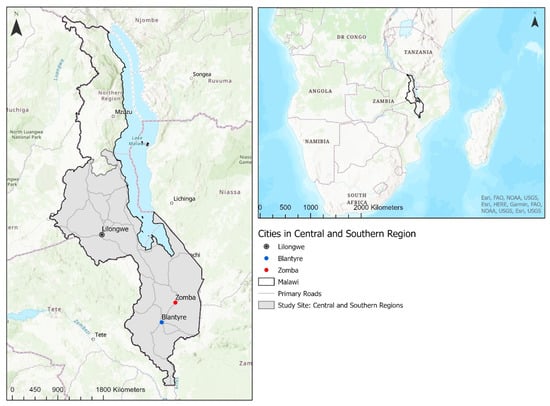 Malawi is a small landlocked country in Southern Africa (Figure 1), which has experienced limited development. Ranked 174th out of 189 countries, Malawi has a low Human Development Index [54]. Malawi has a high level of poverty, with 69.2% of the population living on less than $1.90 a day in 2016 [55], which is below the international poverty line. Over 80% of the population is employed in agriculture, most of which are smallholder farmers [56]. Malawi is characterised by poor quality of land and is particularly vulnerable to extreme weather events, especially in the Southern Region [57]. This threatens the livelihoods of the many smallholder farmers who are dependent on rainfed agriculture for food and to make an income.