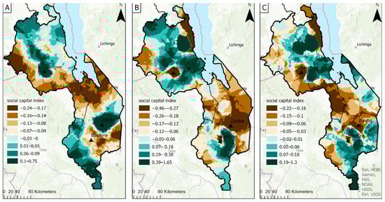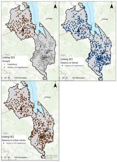 The GWR results show that social capital typologies have a different association with the sustainable development proxies, with associations varying spatially and directionally. Distance to urban areas is an important consideration of social capital as it impacts the quantity and quality of social interactions [105]. Other studies in Malawi have also found a community’s proximity to a road or a city influences its social capital [99,106], and this study also found distances to an urban centre were associated with bonding and linking social capital.