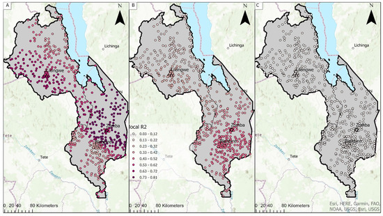 The GWR models were evaluated by mapping the local R2 values (Figure 3), which range from 0 to 1, with 1 reflecting a perfect model [97]. In all three GWR models, the model performed better in the southern part of the study site. As with the adjusted R2 and AICc, the local R2 values show the bonding GWR model was most robust and the linking GWR model did not perform well.
