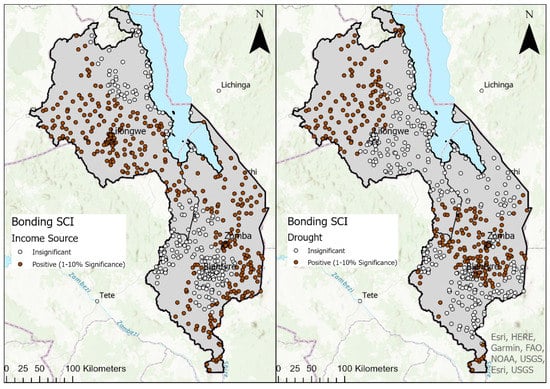 The bonding SCI GWR maps are in Figure 4 and Figure 5. The experience of drought and a non-farming income are associated with a higher bonding SCI. There are clear spatial patterns that exist. The association between the experience of drought and the bonding SCI is only significant in the Southern Region and the northwest of the Central Region. The association with the bonding SCI and income shows significance in the Central Region and the east of the Southern Region.