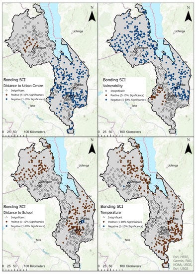 Vulnerability, distance to an urban centre, temperature in the wettest month and distance to school showed both negative and positive association with the bonding SCI (Figure 5). This highlights the importance of spatial modelling, as it captures both the positive and negative associations between variables that would be masked in global modelling.