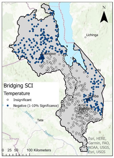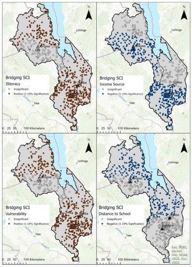 Higher maximum temperatures, longer distances to school and having a non-farming income are associated with lower bridging SCI (Figure 6 and Figure 7). Higher vulnerability and illiteracy are associated with a higher bridging SCI (Figure 6). The spatial pattern of significance with the bridging SCI is similar for both vulnerability and illiteracy rate and is significant in most of the Southern Region and the northern half of the Central Region. Income source shows a significant association in the south of both regions. For the income source and vulnerability, the association with the bridging SCI is the opposite to the association with bonding SCI. Meanwhile, the association between the bridging SCI and maximum temperature in the wettest quarter is significant in the East of the Southern Region and North of the Central Region.