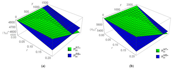 Corollary 2 (1) shows the relationship between firms’ operational decisions and interest rates . The high increases the retailer’s financing cost, thereby hindering the investment of retailers’ sales efforts. Thus, high-interest rates will reduce retailers’ sales efforts. Note that, the offline price and online price increase with the increase in . However, the wholesale price decrease with the increased interest rate . As a result of the increase in , the retailer has to balance the financing, investment, and purchase cost by increasing offline retail prices. As the manufacturer can obtain the retailer’s loan cost, this increases the online price and the loan cost of the retailer. This means that deferred payment can avoid channel price competition in the dual-channel supply chain. This further verifies the views of Qin et al. [34].
