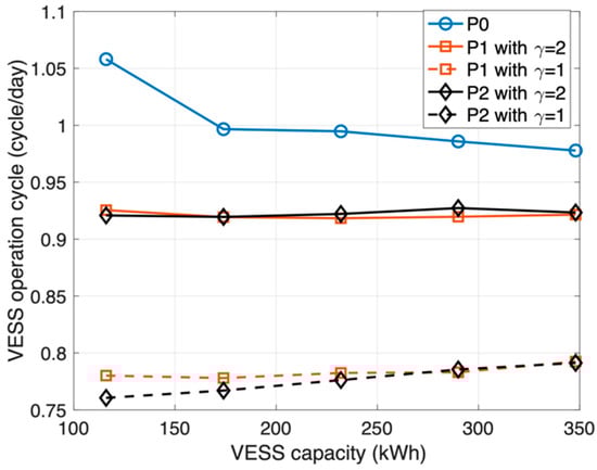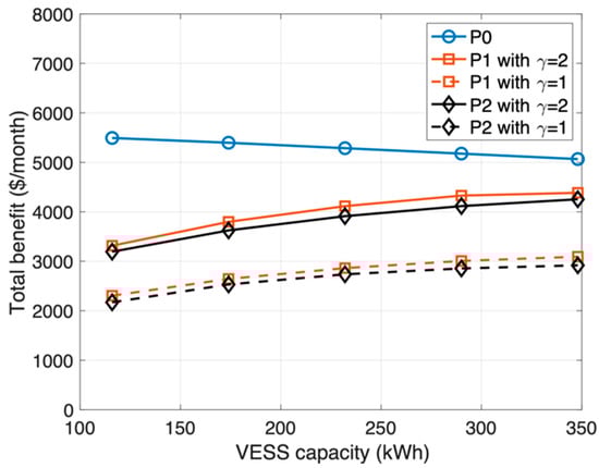 - The benefit or the net reward is directly proportional to the VESS capacity, and the cost using the VESS increases more rapidly, except for P0, as shown in Figure 3. The VESS is operated to achieve the maximum benefit using P0.