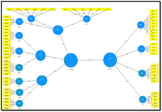 The relationship between knowledge and practice on self-regulated learning (SRL) among teachers of students with learning disabilities (SLD) was tested using partial least square (PLS) method. Analysis of the measurement model (or outer model), the first step of PLS analysis, was used to determine the appropriateness of the theoretically defined construct. The measurement model was examined to ensure the survey questionnaire determines the variables that were supposed to be measured and to simultaneously make sure that the instrument is reliable. In this process, three things were investigated, which are factor loadings, composite reliability (CR), and average variance extracted (AVE) (Figure 1).