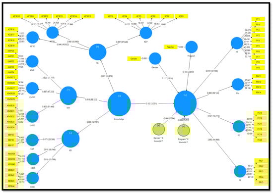 Means and standard deviations by SPSS 25 were used to answer the first question that related to the levels of knowledge and practices of self-regulated learning among SE teachers and GE teachers. In order to analyze the research model, partial least squares (PLS) was utilized, while the Smart PLS 3.0 software was used as the analysis technique [86]. The measurement model (validity and reliability of the measures) was investigated based on the recommendation of two-stage analytical procedures by [87], then followed by an evaluation of the structural model testing the hypothesized relationships [88,89]. In order to check the significance of the loadings and the path coefficients, a bootstrapping method was used [89]. Finally, to investigate the role of teachers’ gender as a moderator variable in the impact of teachers’ knowledge and practices of SRL, the product indicator approach by Smart PLS software was conducted.