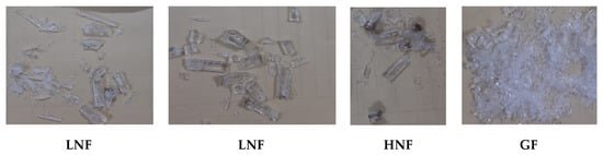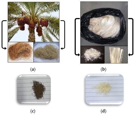 The raw materials used in the present study to manufacture the composite materials were natural fibers, epoxy (LR 1110), hardeners (RC932), and glass fibers. The natural fibers were palm fibers (gathered from the base surrounding the stem of the palm tree plant) that can be found in abundance throughout Asia, South America, and Africa, as shown in Figure 1a. The short palm fiber was exposed to surface treatment by immersing the palm fiber in ethanol at room temperature (see Ref. [22]) to clean it from sand and dust and then immersed in hot water to remove other sediment attached to the surface. After being dried in sunlight for 24 h, the palm fibers were divided into single bundles. The palm fibers were trimmed so that the fibers had an average length of around 3 to 5 mm, with a diameter of 1 mm, as shown in Figure 1c. Subsequently, the short palm fibers were immersed in polyethylene to remove moisture, as recommended by Abdal-hay et al. [5]. The glass fibers were cut from the long continuous fiber, as seen in Figure 1b, to create short fibers with lengths of 3 to 5 mm, as shown in Figure 1d.