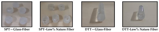 The SPT and DDT investigate the effect of the fiber’s weight ratio, Wt.%, on the stiffness, and diametral tensile strength of short palm fiber-reinforced epoxy-based composite specimen, as shown in Figure 3. The SPT and DTT were carried out using a 100 kN Universal Testing Machine INSTRON-8801 with a 0.75 mm/min crosshead speed for applying axial load-displacement. All experiments acted at room temperature. The load-displacement response until full damage was traced for each test. Five specimens were used for each test to confirm the results.