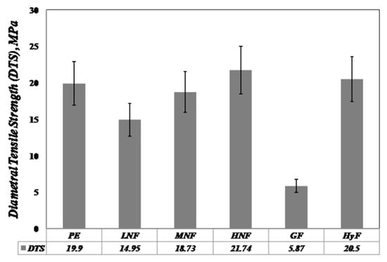 The DTT describes the effect of short palm fiber’s weight ratio, Wt.%, on the diametral strength of epoxy-based composite specimens reinforced with short palm fibers. Figure 4 shows that the DTS of the palm fiber specimens is increased by increasing the weight percentage of short palm fibers. Whereas the maximum value of DTS was recorded for the HNF specimen as 21.74 MPa, the MNF and LNF specimens were reduced by 14% and 30%, respectively, more than that of the HNF specimen, as shown in Figure 4. Moreover, when introducing short glass fibers to the epoxy resin in a Wt.% of 15.8%, the DTS was 5.87 MPa, which means the DTS was less than that of the LNF specimen by 60%. The DTS of epoxy reinforced by short palm is higher than that of epoxy reinforced by short glass fiber; this may be attributed to the strong adhesion between the epoxy and palm fibers. Although the DTS of the hybrid palm/glass fiber specimen is lower than that of the HNF specimen, it is higher than those of single fiber composite of the same Wt.% ratio. This means that some synergic effects can be observed. It is worth noting that LNF, MNF, and Gf have lower DTS than PE. Nascimento et al. [20] found similar results, where epoxy-reinforced with Piassava fiber content of Vol.% up to 20% has a lower flexural strength than neat epoxy. However, they found that epoxy reinforced with Piassava fiber content of Vol.% equal to 30% and 40% significantly improved the epoxy’s flexural strength. In general, they found that the flexural strength of epoxy reinforced with Piassava fiber increased with increasing fiber volume fraction. On the other hand, Sbiai et al. [22] concluded that the neat polymer and the long palm fiber/epoxy composite showed ductile behavior. In contrast, in the case of using short palm fiber, it displayed a brittle behavior.