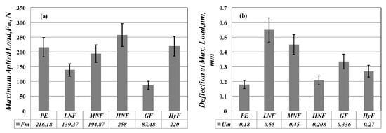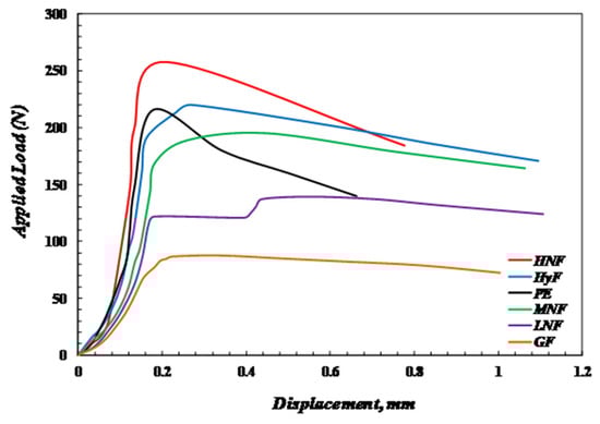 The effect of short palm fiber’s weight ratio on the load-displacement curve extracted from the small punch test was investigated and compared with those of pure/net epoxy (PE) and GF, as shown in Figure 6. The behavior of the load-displacement curves of the PE, LNF, MNF, HNF, and GF specimens is relatively similar and different from the common load-displacement curves of metallic materials, as shown in ASTM E3205-20 [23]. The results revealed several points of interest, as the natural fiber-reinforced epoxy showed superior mechanical behavior compared with the glass fiber-reinforced epoxy. HNF is the only natural fiber-reinforced epoxy with greater strength than PE. Based on the small punch test results, Figure 7a,b shows the maximum values of force, Fm, and its deflection, Um, for a short fiber composite sample with varying weight percentages of palm and glass fibers (PE, LNF, MNF, HNF, and GF). From Figure 7a, for the specimens reinforced with short palm fibers, the maximum load of HNF was 1.85 times higher than that of the LNF specimen and 1.3 times higher than the MNF specimen. In addition, the palm-reinforced specimens provided more resistance than glass fibers, regardless of the palm fibers’ weight ratio. Furthermore, the specimens with a 0% weight ratio of fiber (PE) show higher load resistance than other reinforced specimens except for HNF specimens. On the other hand, the deflection at the maximum load decreased with increasing the palm fiber weight ratio, as shown in Figure 7b. Furthermore, the deflection of the PE specimen is lower than all other reinforced specimens. For the specimens reinforced by natural fibers, it can be concluded that the maximum load increased with increasing the palm fiber weight ratio, while the opposite trend was observed for deflection at maximum load, i.e., the stiffness of the composite increased with increasing the palm fiber weight ratio. HNF specimens showed the highest mechanical properties over the other specimens, i.e., Fm = 258 N, Um = 0.2 mm, and stiffness = 258/0.2 = 1290 N/mm.