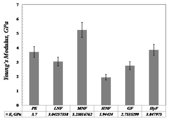 where the slope is the slope value of the elastic region of the load-displacement curve in Figure 6 and λ is the correlation factor which can be computed by using the modulus of elasticity of the epoxy in Table 1. The result of the previous equation is plotted in Figure 8 for the various specimens (PE, LNF, MNF, HNF, and GF). As shown in Figure 8, it can be concluded that no attitude can be shown for the modulus elasticity of short fiber composite specimen with different Wt.% of palm fibers and fiber types.