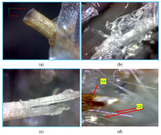 Morphological analysis of the interfacial adhesion between epoxy and palm/glass fibers. (a) Single natural fiber surrounded by epoxy; (b) Bundle of glass fiber surrounded by epoxy; (c) Bundle of glass fiber cracked horizontally; (d) A layer of natural fibers was extracted due to the high load.