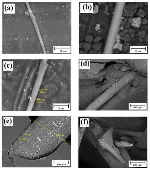 SEM micrographs at the interfacial adhesion between epoxy, palm, and glass fibers (before and after diametral tensile tests). (a) A single glass fiber surrounded by epoxy before the test. (b) A single glass fiber after the test. (c) A single natural fiber before the test. (d) A single natural fiber after the test. (e) A closer view of the natural fiber after the test showing the fiber is attached to the epoxy (white arrows show the silica bodies on the surfaces of the natural fiber, see Figure 12). (f) A group of fractured natural fibers after the test.