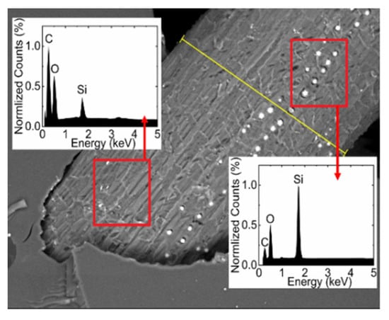 An SEM micrograph of a single natural fiber attached to the epoxy. The inset shows typical EDS spectra obtained from two different positions exhibiting Silicon rich bodies (size ranging from 1 to 10 μm) attached to the surface of the natural fiber.