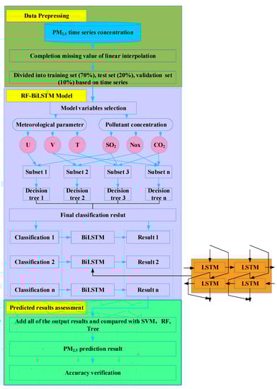 Herein, we present the following innovations: (1) A novel PM2.5 concentration forecast mixed model was recommended to significantly ameliorate forecast precision for the short term as well as the long term. (2) The results showed that the RF model is introduced to decompose the test set independently while the BiLSTM model is coupled. (3) The model was compared with LSTM, SVM, RF, and Tree algorithms. (4) The model was compared with other algorithms, such as LSTM, SVM, RF, and tree. The parameters of different models were adjusted according to the model performance, and the data of different lead times were selected to observe the experimental results. (5) The new mixed-mixing model performs well in spatiotemporal generalization and in reflecting the context relationship of the time point.