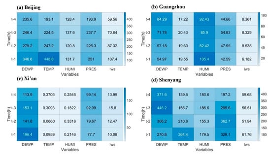 It is indicated in Figure 4 that five meteorology parameters were employed with the RF method to classify the importance of each element. Different meteorology parameters have different OOB values among different cities. In Beijing, the OOB value of air temperature is the highest at t-1 and has the greatest influence on PM2.5 concentration, followed by DEWP, while the OOB value of Iws is the lowest at T-4 and has little influence on PM2.5 concentration.