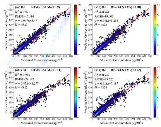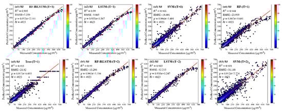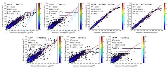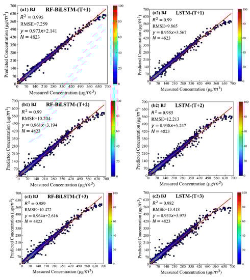 From Figure 5a1,b1,c1, the improvement of the prediction accuracy can also be indicated at other times. The results with the RF classified results at the T + 2 and T + 3 moments are similar to those at the T + 1 moment. Additionally, forecast precision is significantly modified, especially in the capacity to forecast peak score. The degree of RF-BiLSTM strength of forecast accuracy consequences alters with time, and the R2 value ranged from 0.989 (T + 3) to 0.995 (T + 1). The reason may be that the prediction error of components increases rapidly with predicting time growth. Additionally, the same pattern applied in SY, XA, and GD cities is shown in Supplementary Materials Table S1, Figures S1–S3.