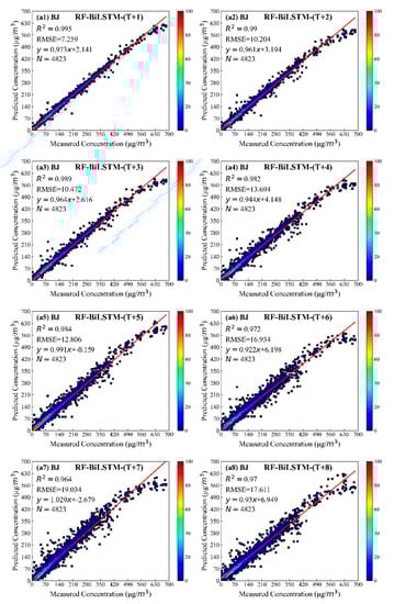 Through the established model testing, it is found that the RF model classification results will have a great positive effect on the final prediction results. The R2 has increased significantly from 0.99 (LSTM model) to 0.995 (RF-BiLSTM) at the T + 1 moment. Without RF model classification, forecasting at the T + 1 moment will evaluate PM2.5 concentration at a high level. After conducting the RF model classification based on the useless information filter of previous data with similar input parameters of the BiLSTM model, the high evaluation of predicting consequences could be noticeably modified. RMSE was decreased significantly by ~26.4% (from 9.87 μg/m3 to 7.26 μg/m3), and MAE was decreased from 5.15 μg/m3 to 3.73 μg/m3, with a decrease of 27.6%. The consequences validated fully illustrate that RF classification is a very necessary step which could significantly improve the forecast precision of the mixed model.