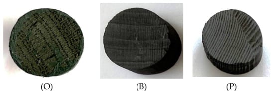 Charcoal was manufactured by partial combustion in an E5CK-T (Lithuania, SNOL, Umega) carbonization system muffle furnace with a heating rate of 10 °C/min; burning time was 1 h under oxygen-limited conditions and under atmospheric pressure. Pyrolysis was performed at the peak temperature of 330 °C. The prepared samples of charcoal were homogeneous, solid, and isotropic, as shown in Figure 1.