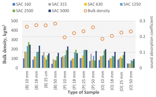 The highest bulk density, 473 kg/m3, was that of birch with a 50 mm thickness. The minimum value of bulk density, 310 kg/m3, was that of the 10 mm thick oak. The bulk density of charcoal ranged between 310 and 535 kg/m3; birch had higher bulk density, from 440 to 473 kg/m3, than pine, from 327 kg/m3 to 433 kg/m3, and oak, from 310 to 390 kg/m3. The minimum range of bulk density, from 310 to 390 kg/m3, was that of oak. The sample of 10 mm thick birch had a density of 440 kg/m3 with an SAC of 0.16 at 2500 Hz, which was the highest value. The sample of 50 mm thick birch had a density of 343 kg/m3 with an SAC of 0.04 at 2500 Hz. The sound absorption coefficient increased with the decrease in density (Figure 3).