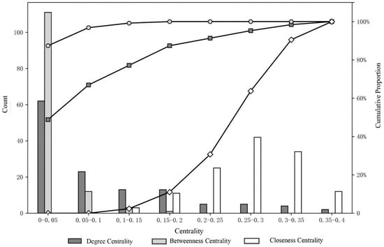 The origin, attachment, and termination of CRs, the interweave and overlap of CRs, and the sailing frequency make the positions and functions of ports different, which profoundly affects the development potential of ports. We calculated the centrality of each port, and the results are shown in Figure 2 and Figure 3. The degree centrality of the cruise ports is between zero and 0.4, which varies greatly because of geographical factors and the route network structure. Nearly half of the cruise ports have a degree centrality of less than 0.05, and fewer than 10% have a degree centrality of more than 0.3, which indicates that only a few ports in the cruise shipping network are connected with most of the other ports in the network and have high shipping connectivity. These ports are mainly tourist source ports or major tourist destination ports. However, most ports are only connected with a few ports, and these ports are mainly tourist destinations with fewer tourism resources but outstanding characteristics. The betweenness centrality of the cruise ports is between zero and 0.2; 60% of the ports have a media centrality of less than 0.01, while only 5% of the ports have a media centrality of higher than 0.1. This reflects the fact that there are no ports obviously located in the middle channel in the cruise shipping network as a whole, and only a few ports show certain channel intermediation and serve as important port nodes through which many CRs pass. The closeness centrality of the cruise ports is between zero and 0.4, and the overall distribution is relatively uniform, showing the structural characteristics of low at both ends and high in the middle. This indicates that the closeness centrality of the cruise ports presents a relatively balanced spatial distribution, and there is no core port in the cruise network whose transport accessibility is significantly higher than that of other ports.