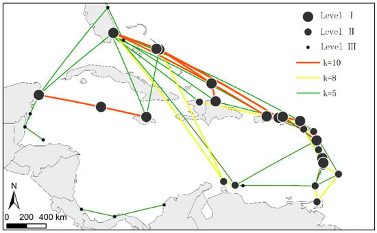 (2) The number of ports involved in shipping groups at different levels is relatively small, but there are many sailings involved. Although the number of cruise ships attached to each port shows a decreasing phenomenon, the decrease is small. The number of ports involved in level I is 15, accounting for 11.8% of the total number of ports; the number of sailings is 397, accounting for 26.9% of the total number of the sailings, and the average number of sailings is 26.5. Level II covers 25 ports, accounting for 19.7% of the total number of ports; the number of sailings is 640, accounting for 43.3% of the total number of sailings, and the average number of sailings at ports is 25.6, a slight decrease. There are 38 ports involved in level III, accounting for 29.9% of the total number of ports; the number of sailings is 906, accounting for 61.3% of the total number of sailings, and the average number of sailings in each port is 23.8, showing an obvious trend of decline. The network formed by level III already reflects more than 60% of the shipping links in the Caribbean.