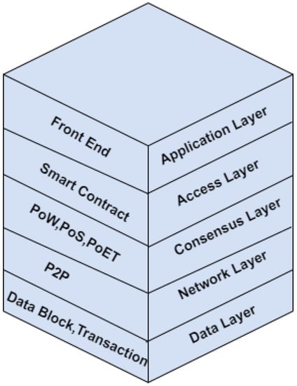 Blockchain technology supports a decentralized network where no one is the sole owner of the system [39]. The layered architecture of blockchain-technology-supported applications is shown in Figure 2. At the application-layer level, the front end developed in HTML, React, Javascript, etc. is used to access the system [40]. All the logic is written in the form of smart contracts at the access layer. Then, consensus is achieved via different algorithms such as proof of work (PoW), proof of stake (PoS), etc., at the consensus layer [41,42,43,44,45]. It supports a peer-to-peer system at the networking level. Data are present in the form of transactions and blocks at the data layer.