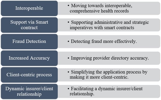 Multiple benefits can be achieved by different stakeholders from distributed ledger technology, as shown in Figure 3. A healthcare application can spur the construction of a new type of “smart” healthcare worker which can produce personalized treatment plans [46,47,48,49]. All the stakeholders can access the information with proper access controls in a decentralized peer-to-peer network. The following are the benefits of employing this technology in the healthcare industry: