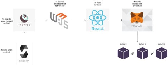This will make it easier for all stakeholders to exchange and communicate information. Smart contracts include data authorization restrictions. It can also assist in tracing all actions associated with a unique ID from the point of origin to the current instance of time. There will be no need for a centralized organization to supervise and authorize the operation because this can be done directly through the smart contract, considerably lowering the cost of administration. To ensure performance and economic sustainability, all medical record data are saved in interplanetary file storage, and the content identifier (CID) of the record is committed to the chain. The smart contract includes the registration of the entities, uploaded documents, treatment process details, and insurance claim process. The tools used in the implementation of the proposed work are shown in the Figure 5. It includes Solidity for smart contract development. It uses Truffle suit for the local blockchain environment. It employs web3.js library to connect the smart contract with the front end. Metamask wallet is used to enable the interaction of the code with the blockchain.